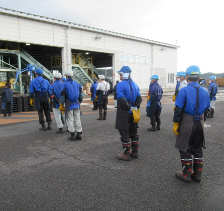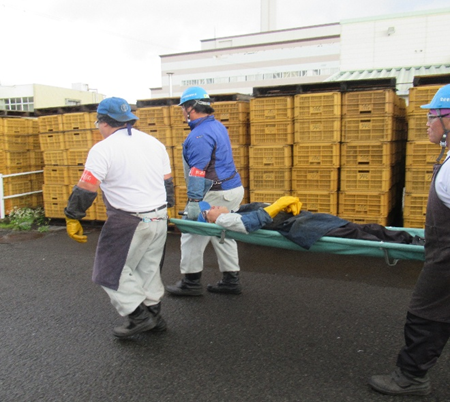 訓練は残渣(ざんさ)ピットから出火したことを想定して、火災発見から全員が速やかに避難できるよう行いました。各担当者が分担して機械類の停止、搬入制限、担架を使っての負傷者の搬送などに対応し、その他の従業員は速やかに避難できるよう訓練に取り組み、慣れないながらも短時間で全員が安全な場所へ避難することができました。