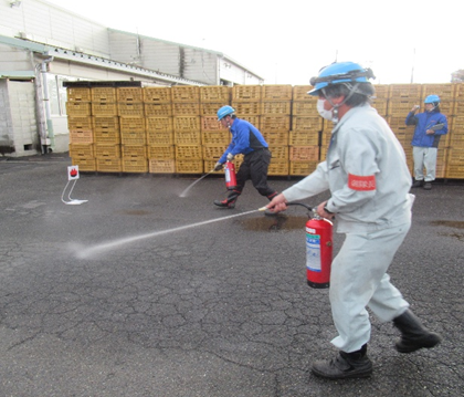 次に水消火器を使った消火訓練を行いました。普段あまり使う機会のない消火器に戸惑いながらも使い方や消火方法を再確認し、今年の消防訓練は終了しました。