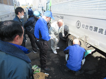 その後、車両の日常点検や冬季に使用するタイヤチェーンの装着方法を学び、小鶴事業所構内でのコース運転やバックによる駐車などの運転練習を行いました。車両感覚をつかんできたところで少し路上に出て松森資源化センターまで運転しました。松森資源化センターでは、トラックスケールに駐車する練習などを行い小鶴事業所まで戻りました。